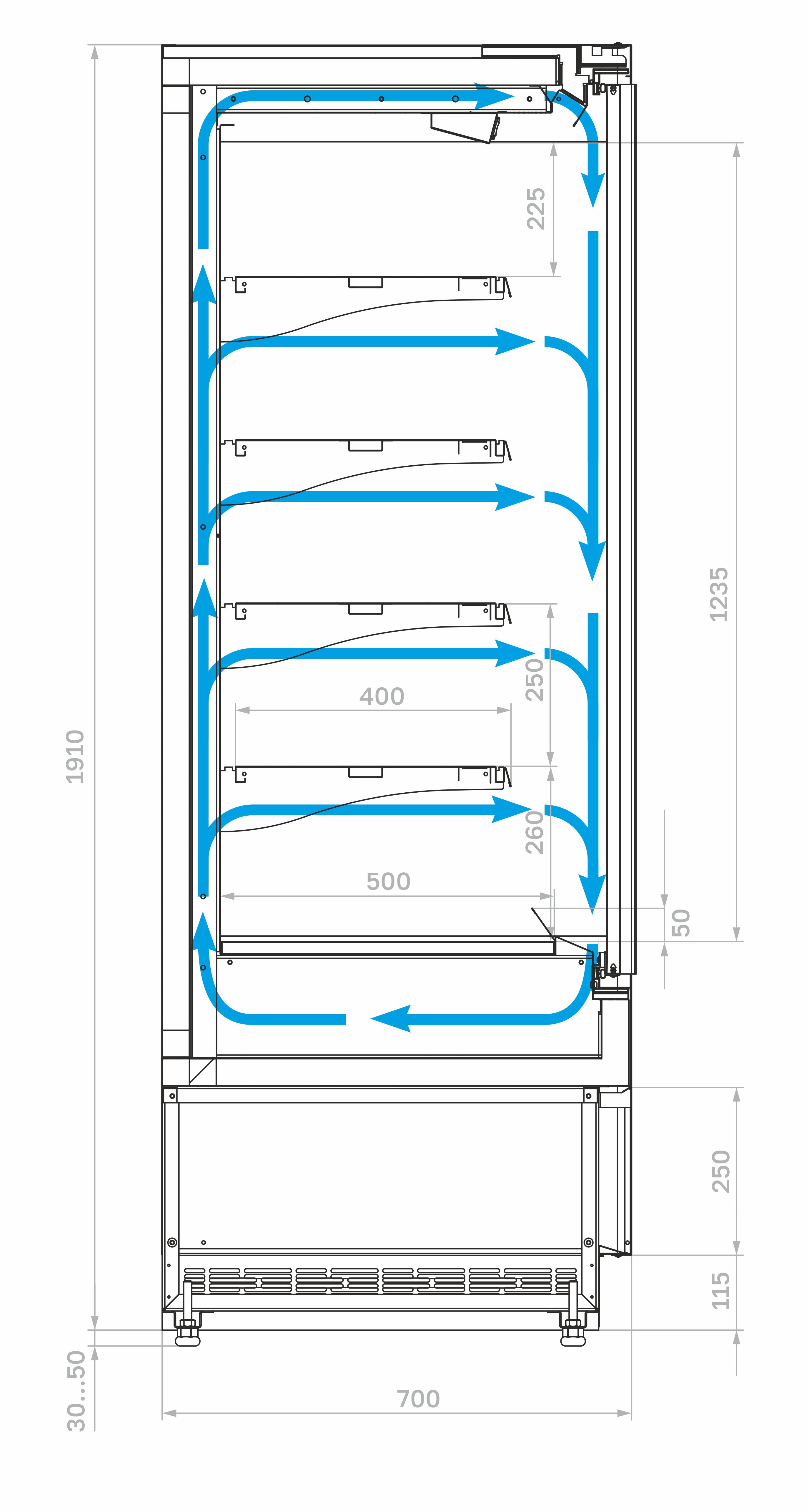 Модель оснащена 4 рядами навесных полок с кронштейнами, 1 распашной дверью, подставкой с фронтальной термовыводящей и цокольной решетками. Корпус прямоугольной формы изготовлен из стали с антикоррозийным покрытием: внешние панели, полки и кронштейны серого цвета (RAL 9006), цоколь и интерьер — черного цвета (RAL 9005). Теплоизоляция выполнена из пенополиуретана.