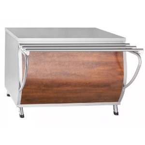На передней части корпуса установлены бесшовные направляющие для подносов — они обеспечивают плавное и безопасное перемещение, облегчая процесс обслуживания посетителей. Служебная сторона прилавка оснащена встроенным шкафом, где удобно хранить посуду, инвентарь и вспомогательное оборудование.