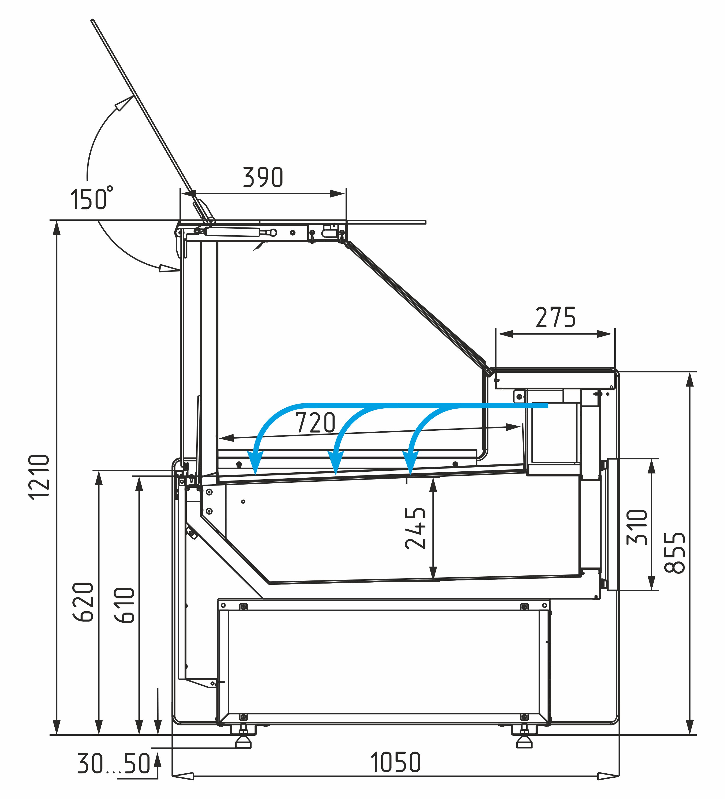 Модель оснащена энергосберегающими шторками, столешница и экспозиционная поверхность выполнены из шлифованной нержавеющей стали, а передняя панель — из ламинированного МДФ.