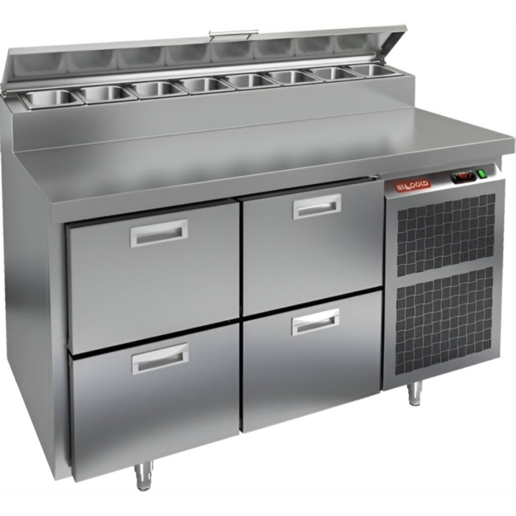 Стол холодильный для пиццы HiCold PZ2-22GN (1/6) предназначен для кухонь и предприятий общественного питания. Он используется для раскатки теста, подготовки ингредиентов для пиццы, салатов и других блюд, а также для охлаждения и кратковременного хранения скоропортящихся продуктов. Модель совмещает нержавеющую рабочую поверхность и охлаждаемый отсек с 4 выдвижными ящиками, обеспечивая удобный доступ к ингредиентам и эффективное хранение без дверей.