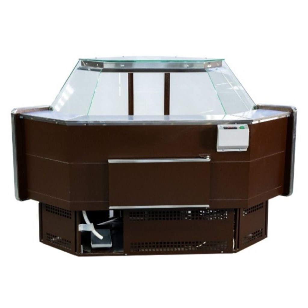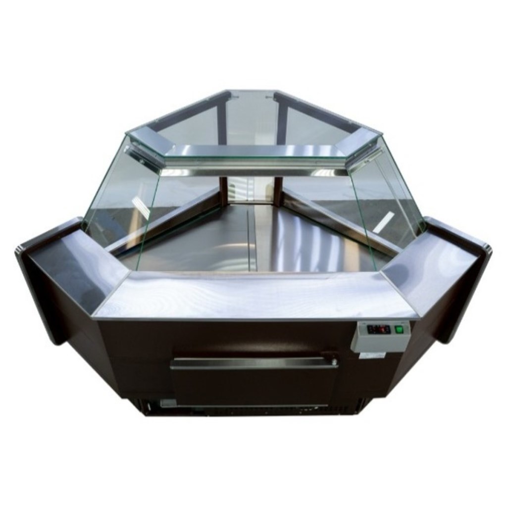Модель оснащена наружным углом, позволяющим стыковать витрины в линии или угловые выкладки, обеспечивая эстетичный и функциональный переход между секциями торгового оборудования.